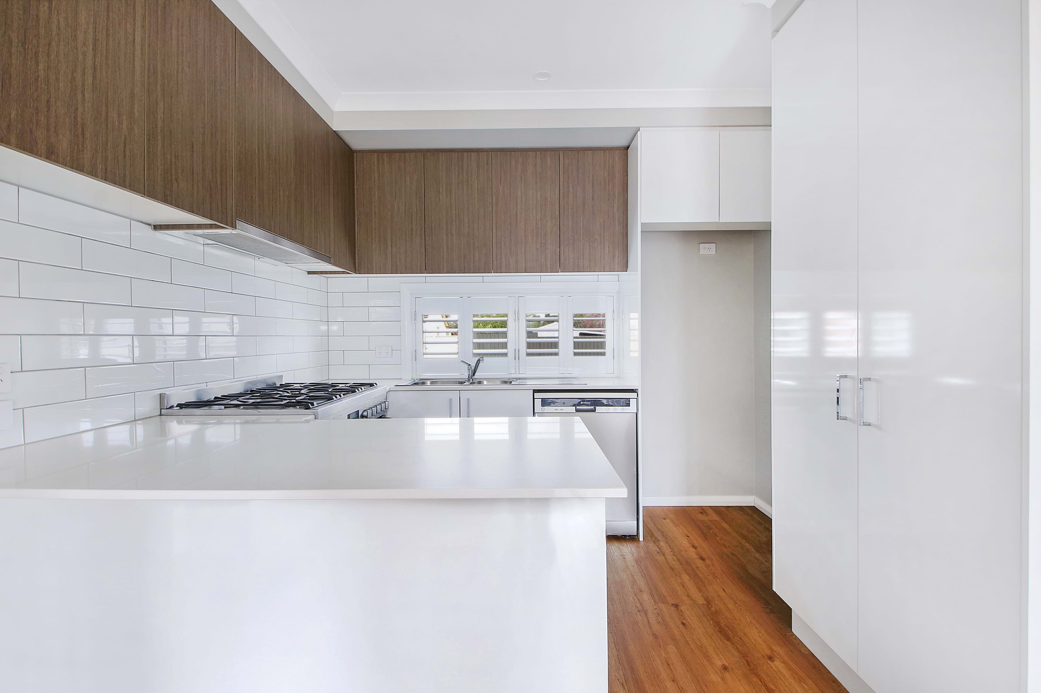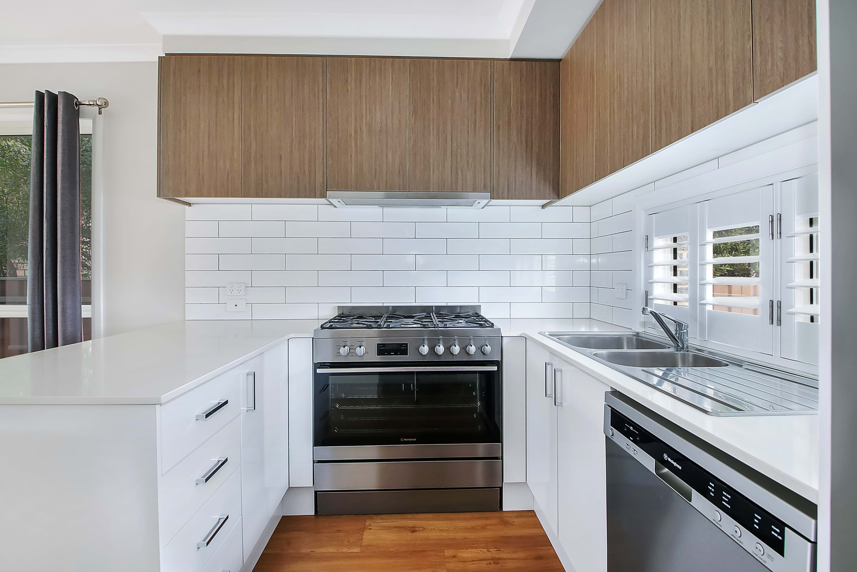 The open-plan kitchen, living and dining areas are flooded with natural light, creating a warm and inviting ambiance. The state-of-the-art kitchen is a dream, complete with a 900mm oven, gas cooktop, dishwasher, stone benchtops, and ample storage. The living space is further enhanced by quality shutters for privacy, bench seating, high ceilings, and premium flooring.