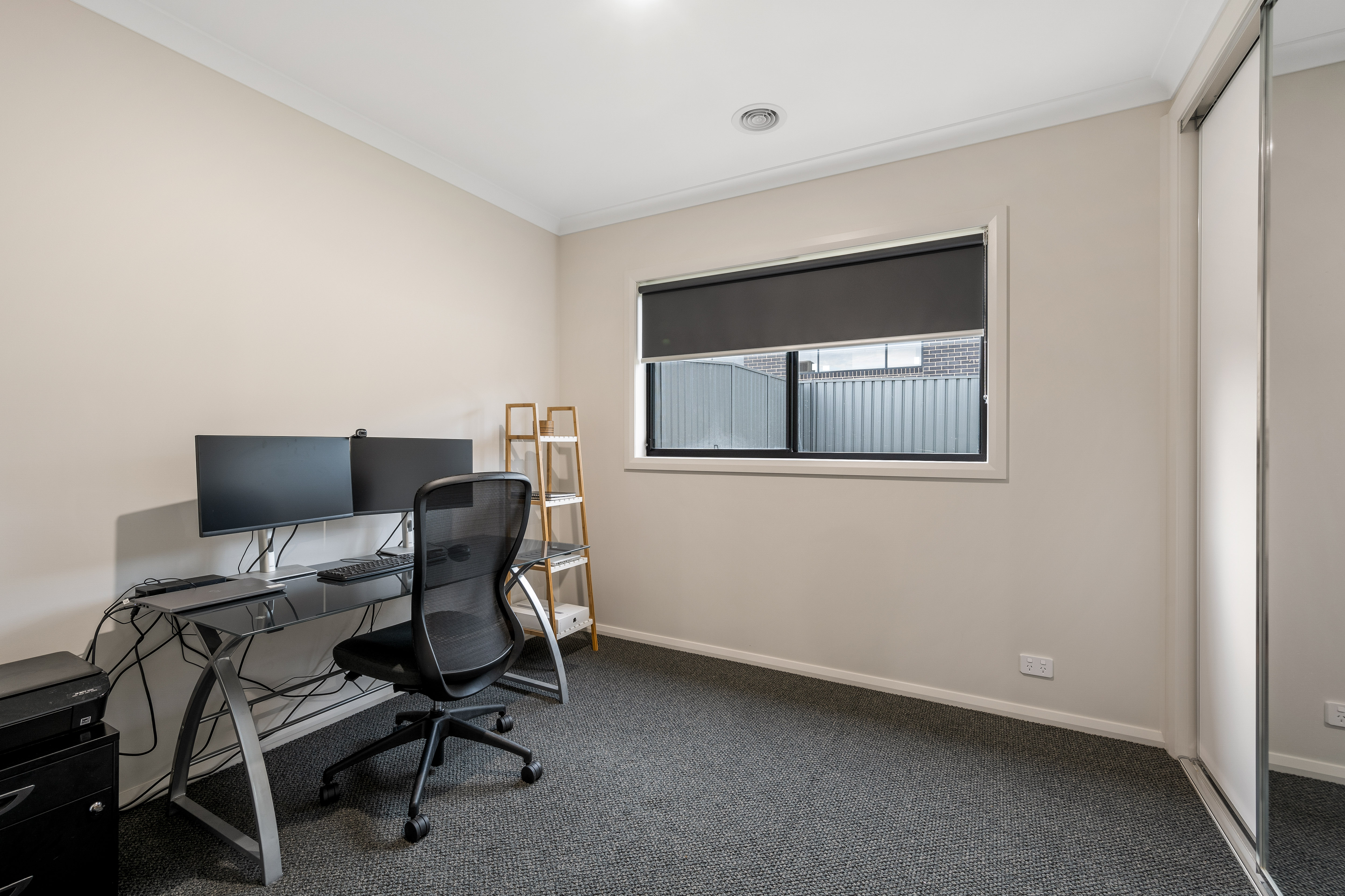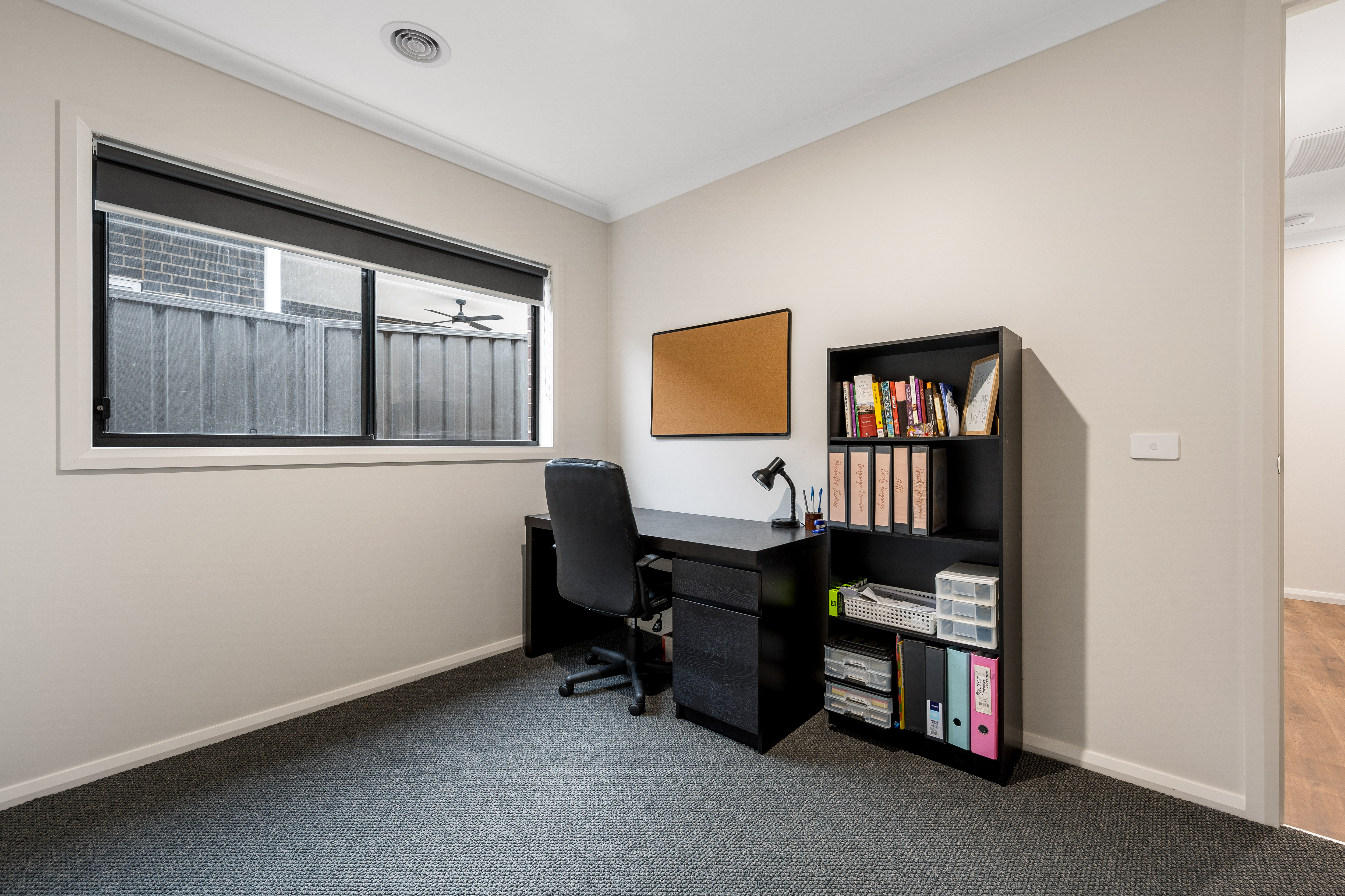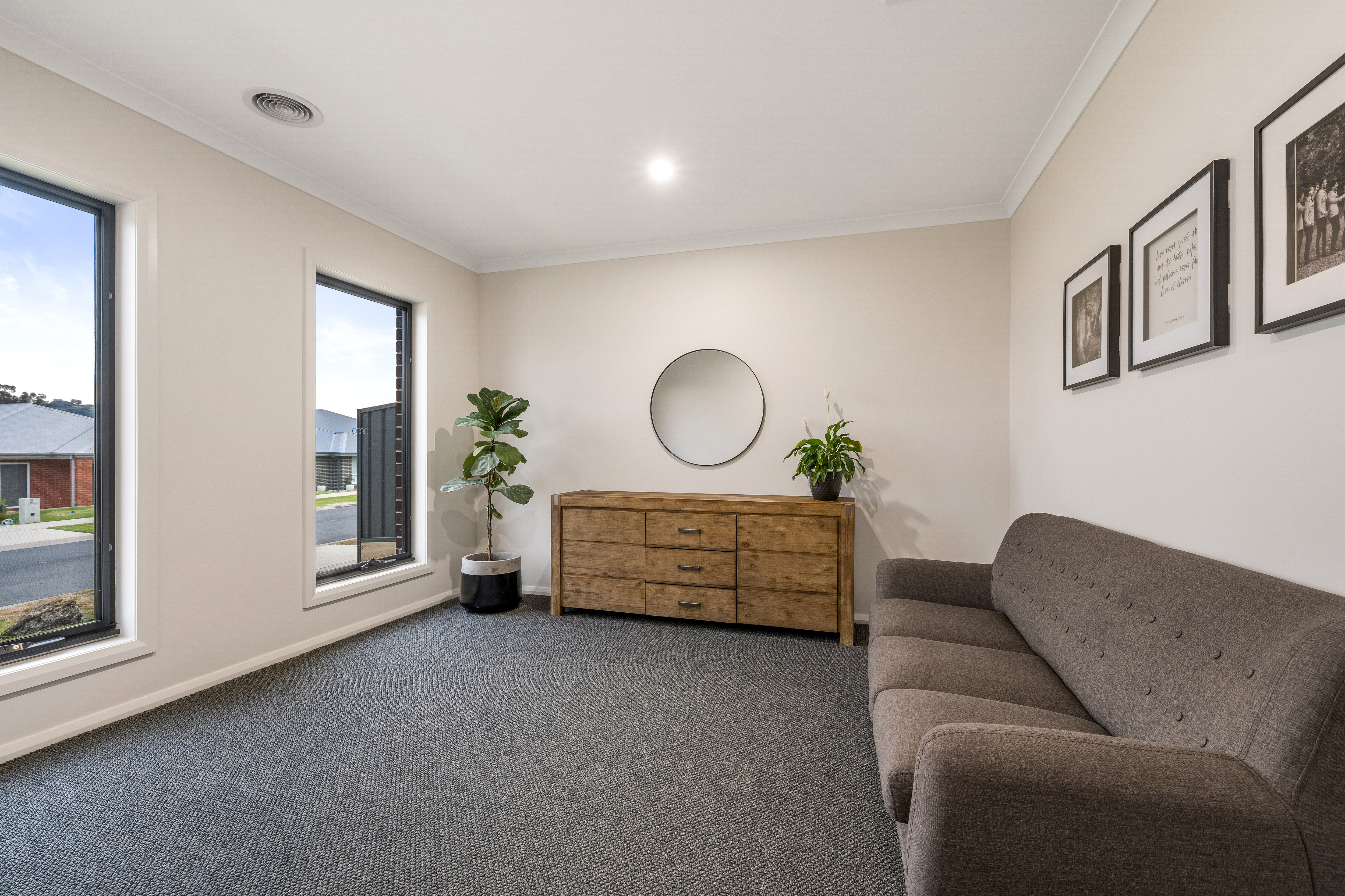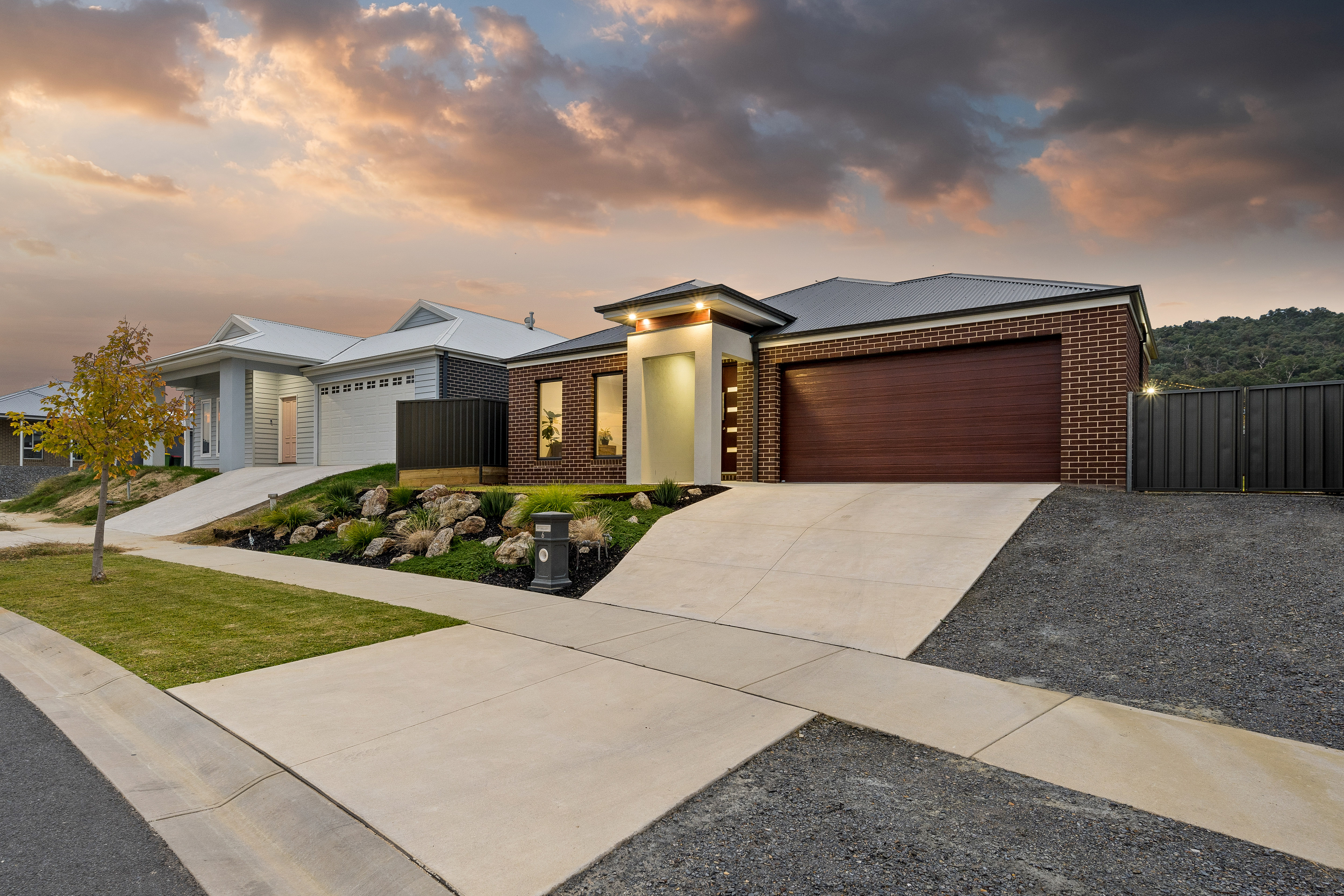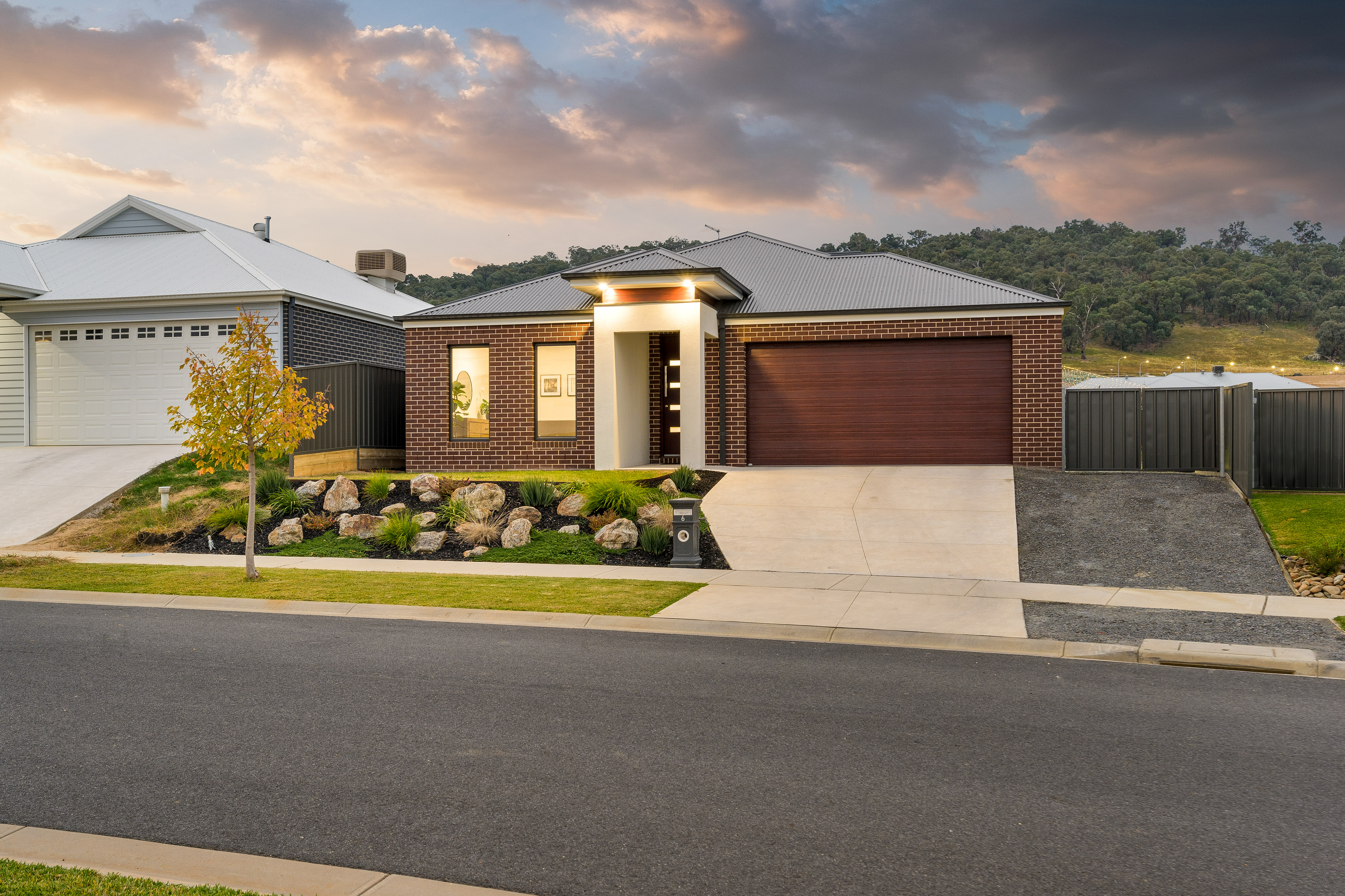 This stunning residence is set high up on the block, with lovely views from the front rooms to the southeast, of the Baranduda Range. As you step into the home through the large front door, you immediately sense the quality and style that comes with a well designed new residence. The beautiful dark floorboards feel great underfoot and lead you into a large, restful front sitting room. Continue down the hallway, past the garage with remote panel door, into the master bedroom. Featuring plantation shutters, this bedroom has warmth and luxury oozing from it. The walk-in robe and ensuite come off the bedroom with separate entrances, and the ensuite features a timber-look benchtop and a spacious double shower.