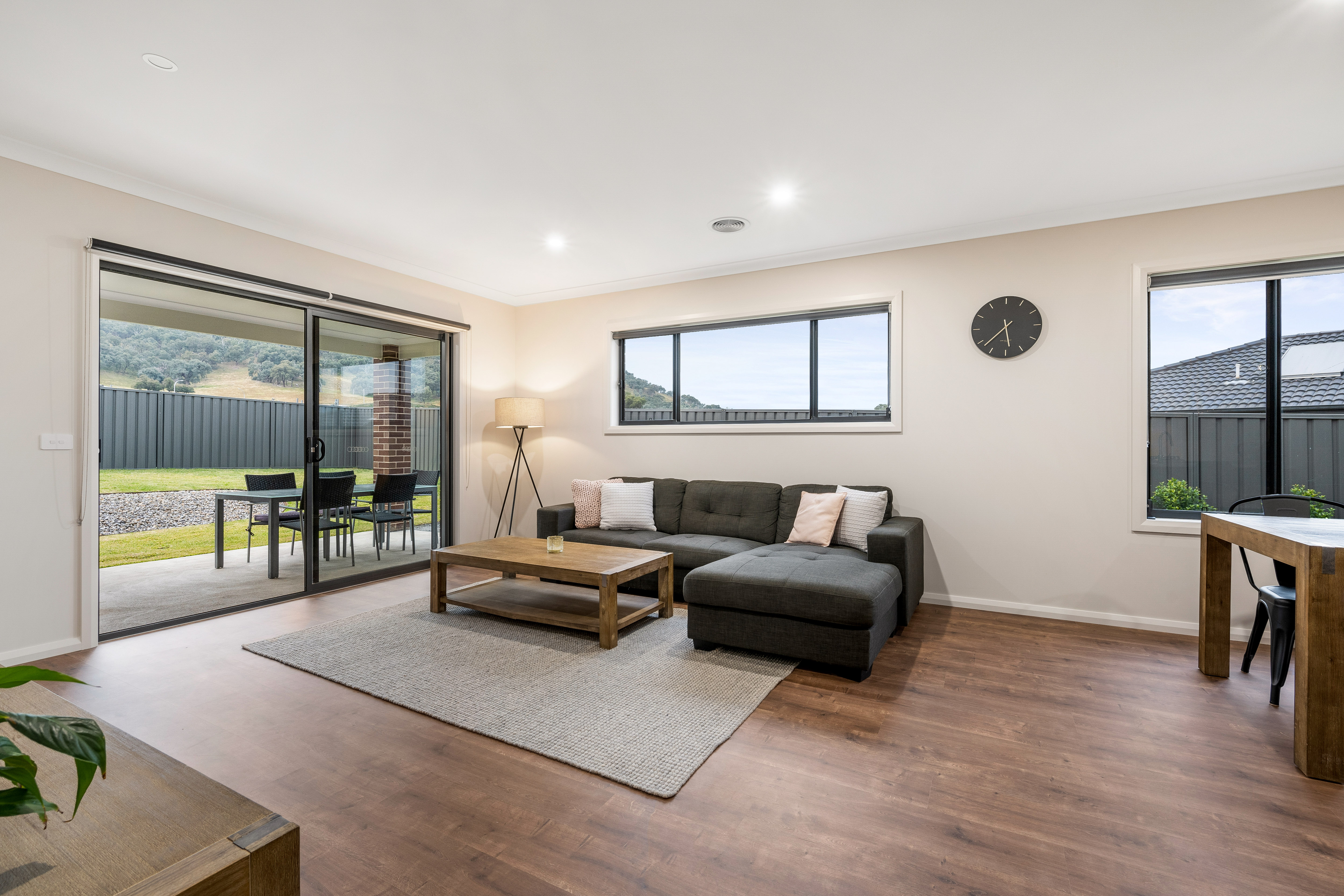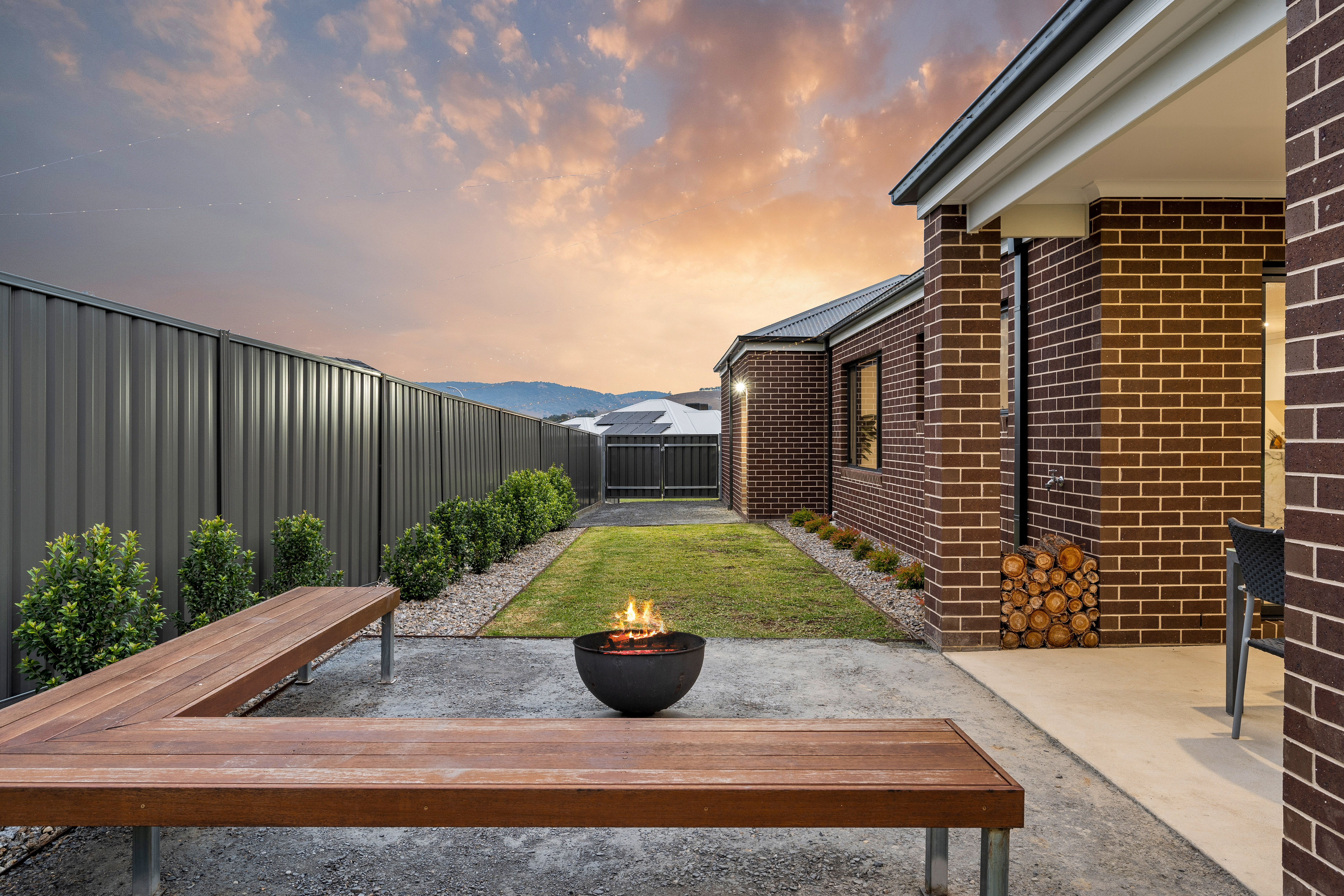 The alfresco looks out to the north, soaking up the morning sun. Gorgeous views of the Wodonga hills allow you to relax and enjoy your surrounds. The fire-pit area adjacent to the alfresco is a fantastic entertaining space, framed by ambient fairy lights. This arrangement means you can enjoy the outdoors at all times of the year, in all sorts of weather.