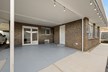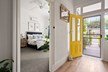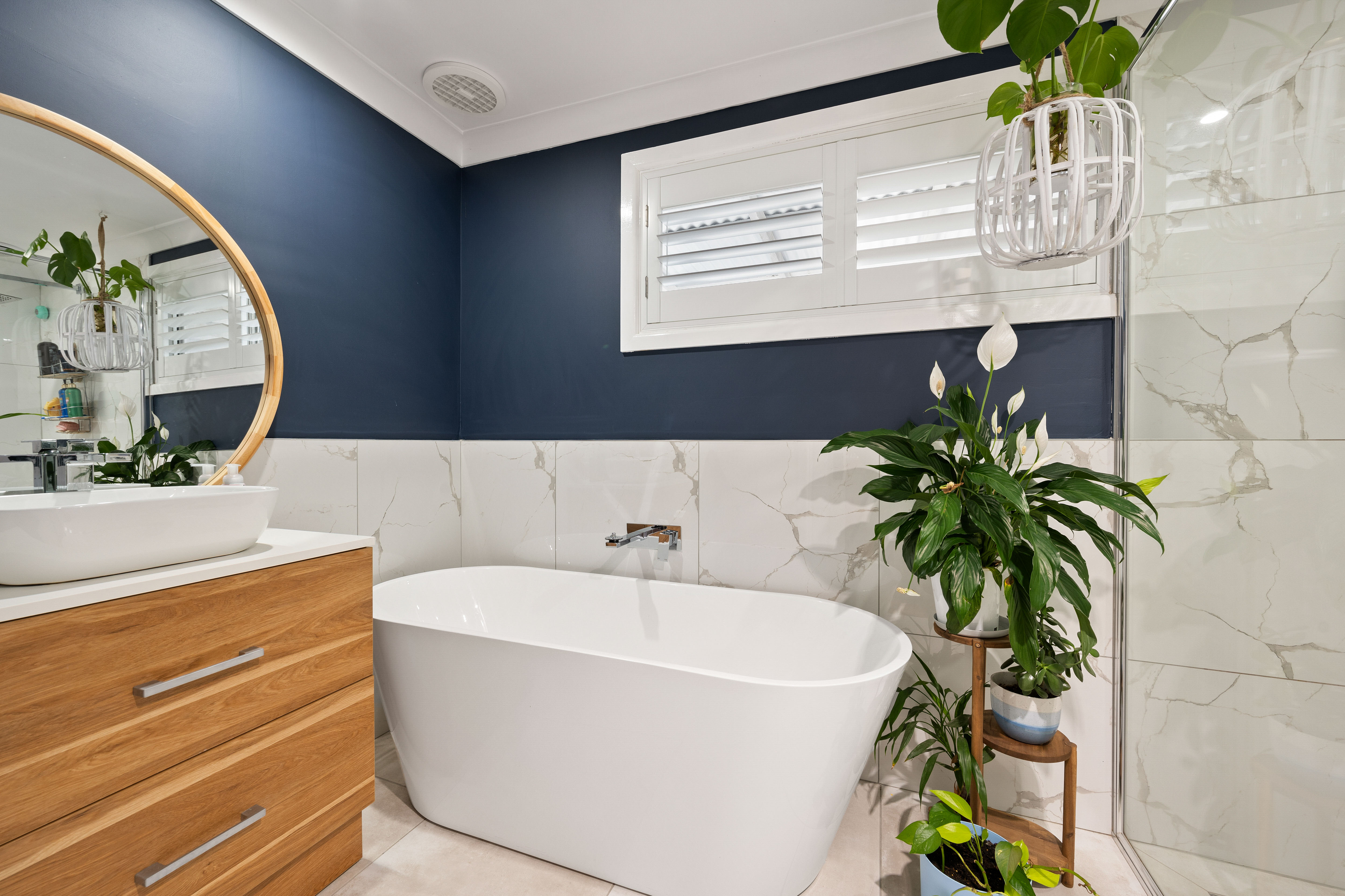 A barn door to the modern bathroom features a deep bath, floating vanity and walk in oversized shower. The property caters to both family living and easy care for the downsizer.