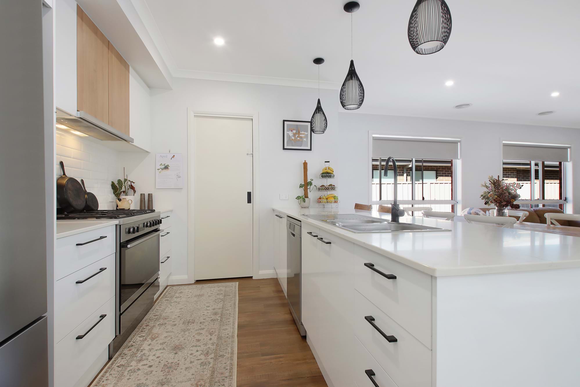 The sleek kitchen is sure to impress, featuring stone benchtops, a 900mm stainless steel oven, dishwasher, ample storage, and a walk-in pantry with full cabinetry.
