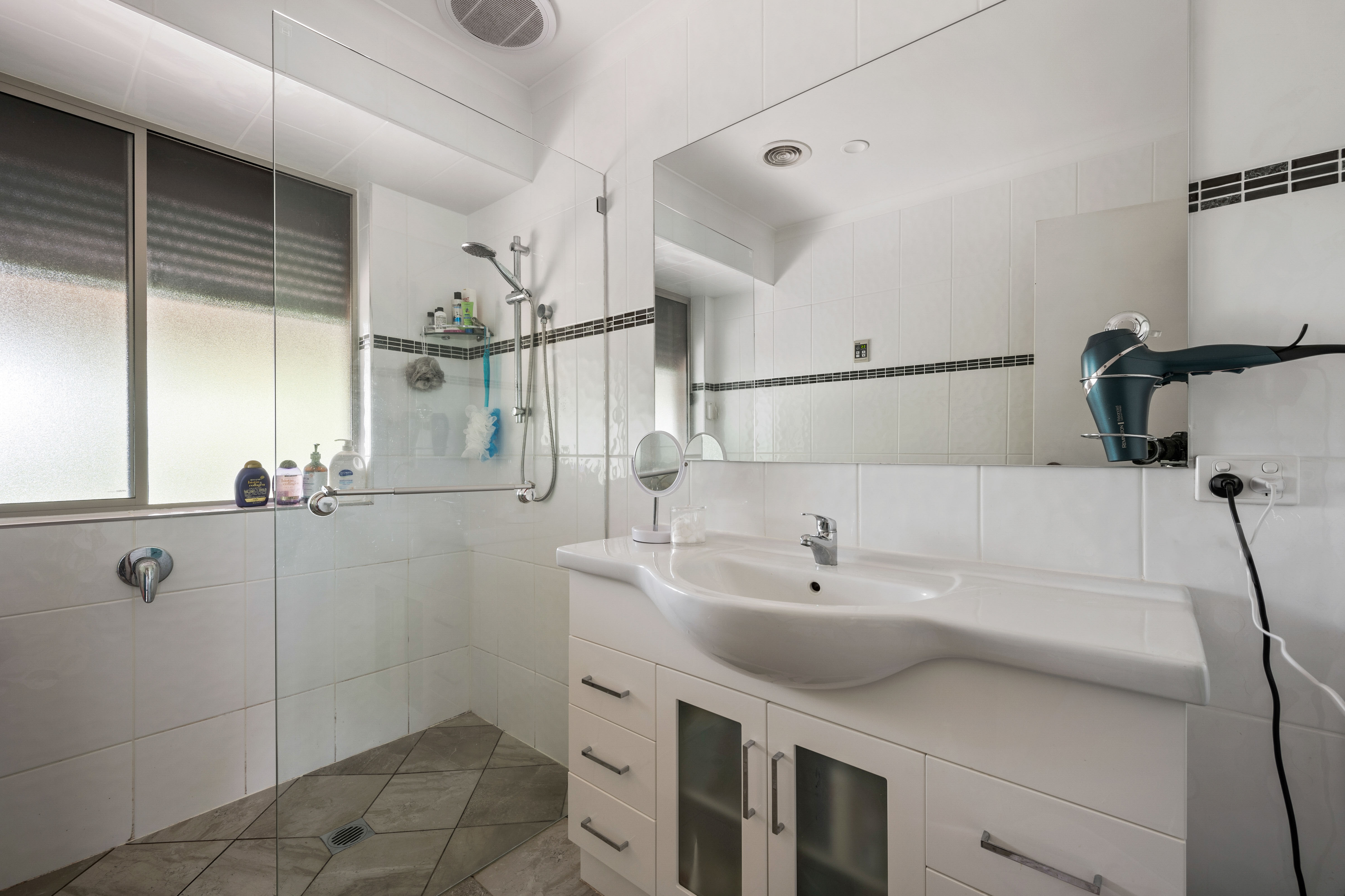 Adding to the appeal, the recently renovated bathroom boasts a spacious walk in frameless shower, a great sized vanity, and providing a modern touch to this classic home. Convenient and practical, the toilet is separate from the bathroom, and can be found within the adjacent laundry space, offering additional privacy and functionality.