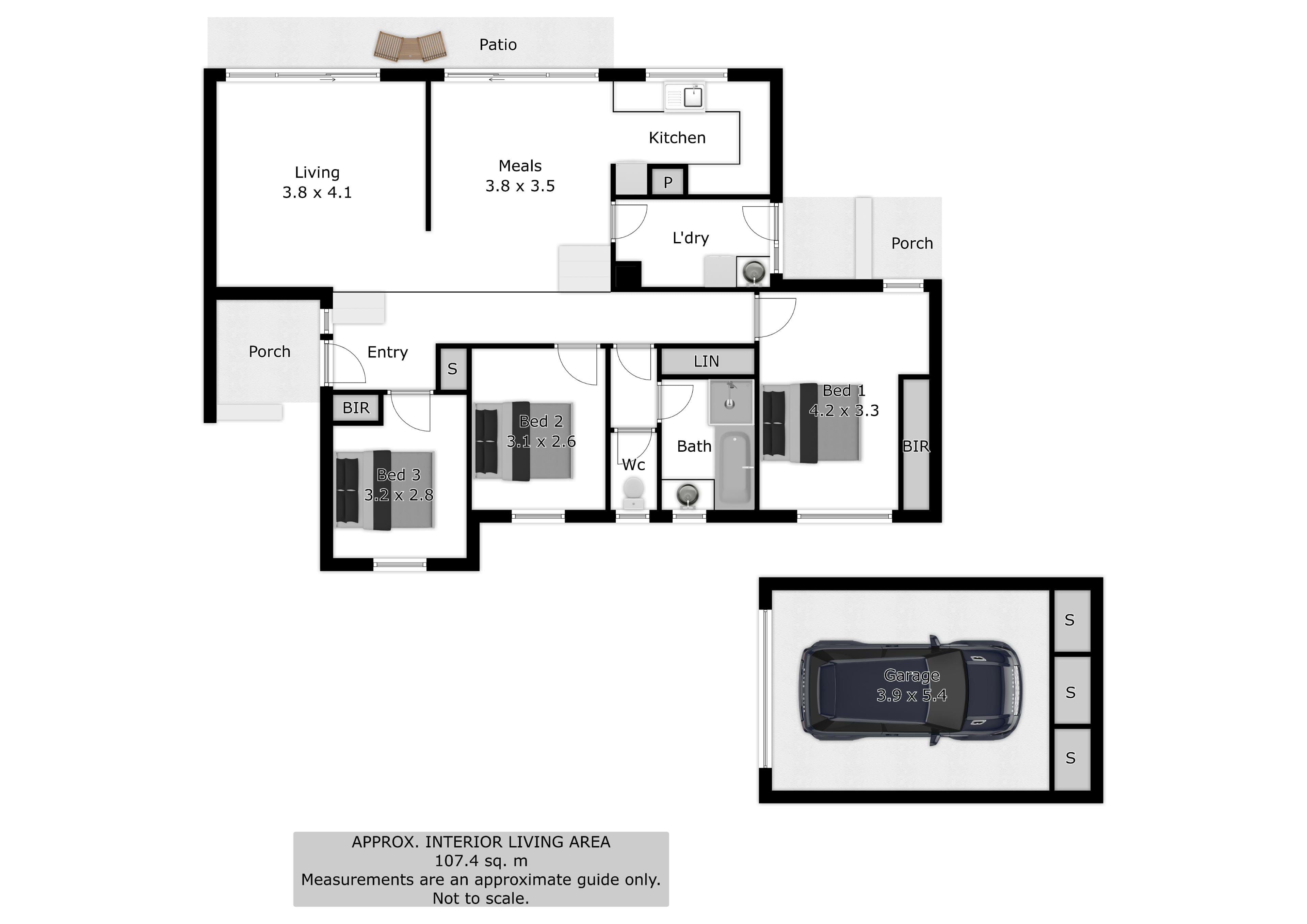 • 3 Bedrooms, 2 with built-in-robes, together with a white and bright bathroom and separate toilet.
