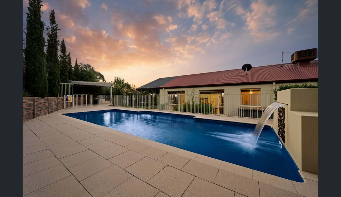 The picturesque well designed pool has a tranquil water feature, lots of room for seating and perfect plants to enjoy the peaceful surround.
