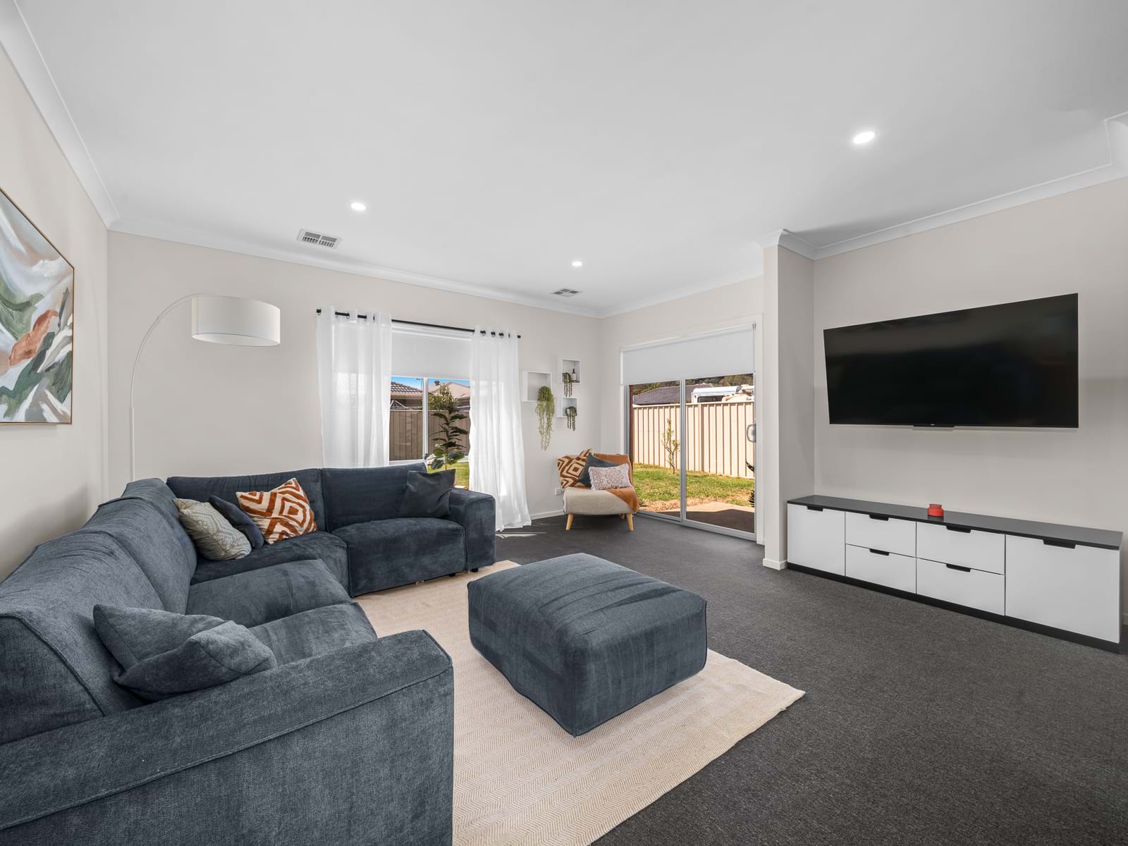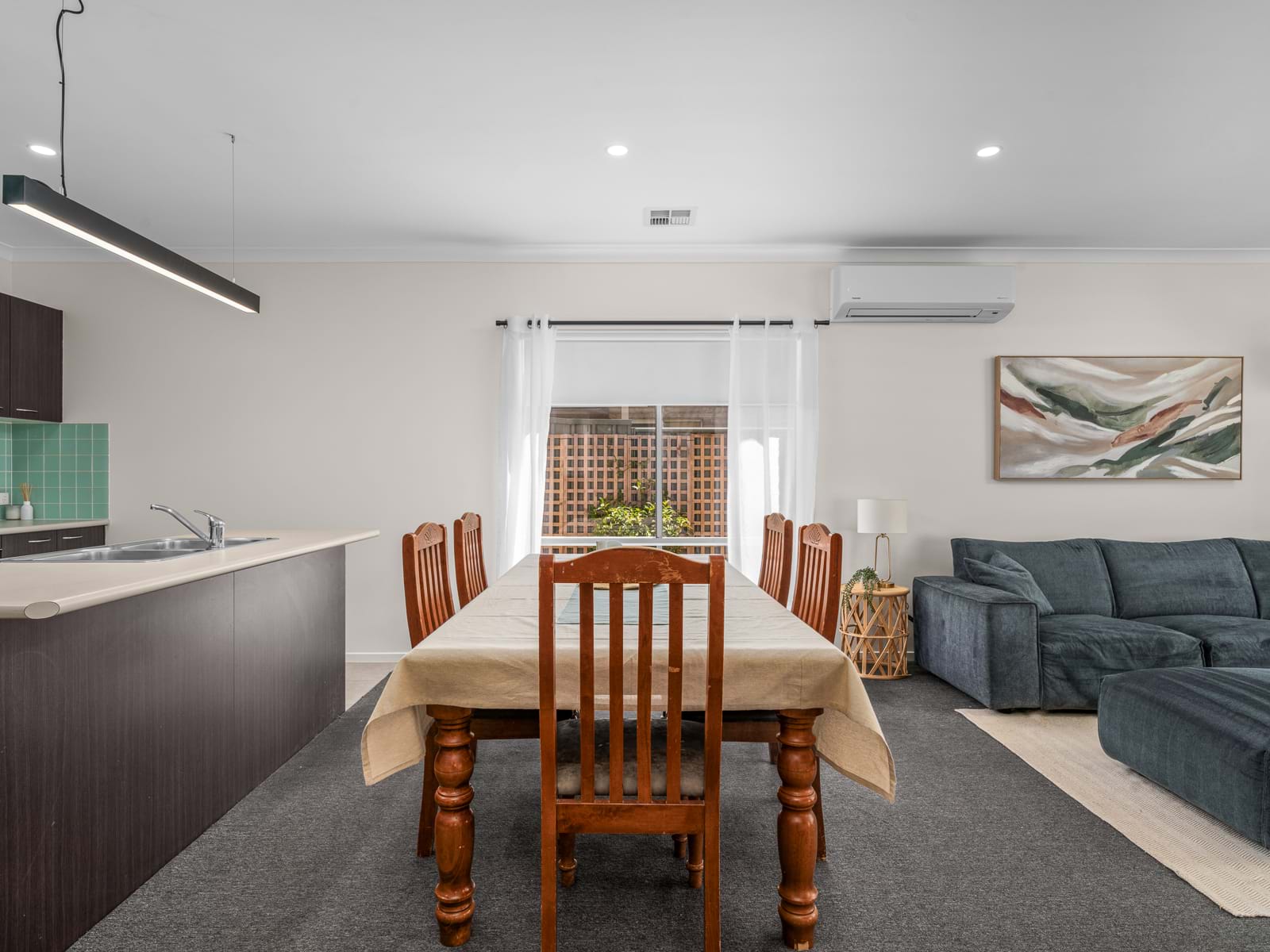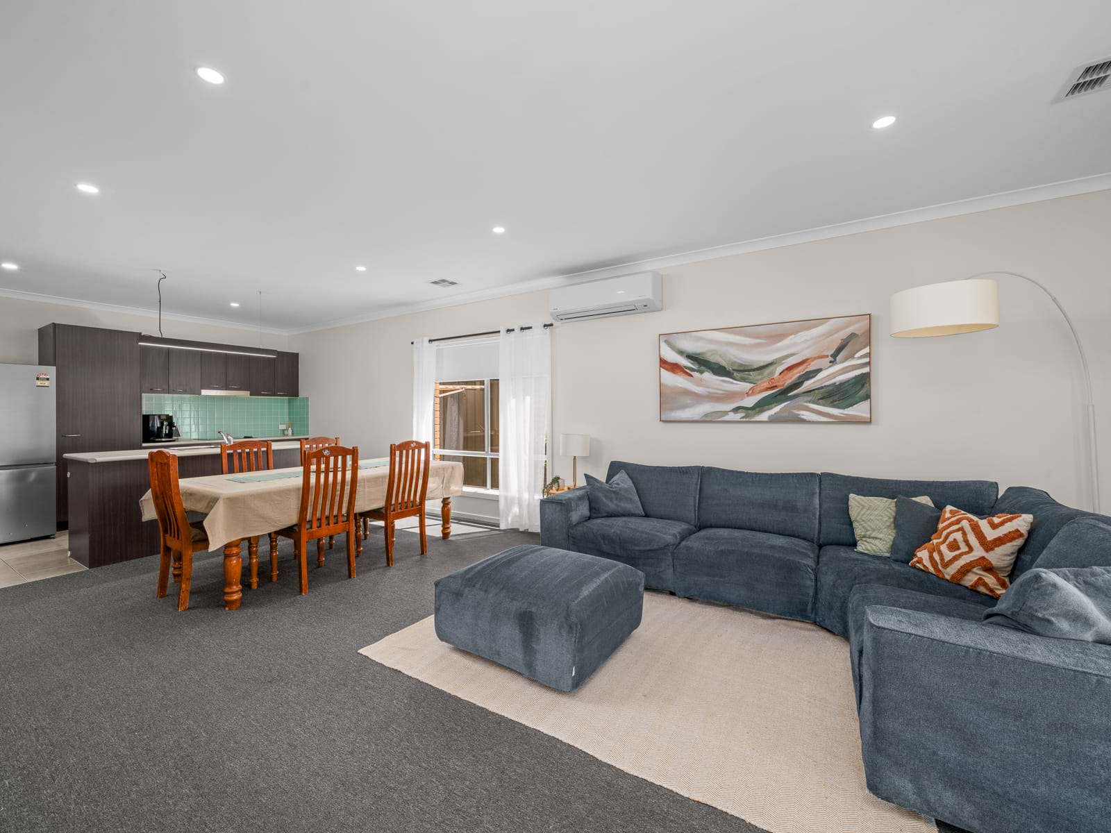 The open-plan design allows for seamless living, with a split-system cooling and ducted heating units that service the entire home for year-round comfort. The spacious living area opens to a pergola and convenient backyard, creating the perfect setting for family gatherings or entertaining guests. The modern kitchen, featuring electric cooking and a dishwasher is thoughtfully positioned overlooking the dining area, making both daily meals and hosting effortless.
