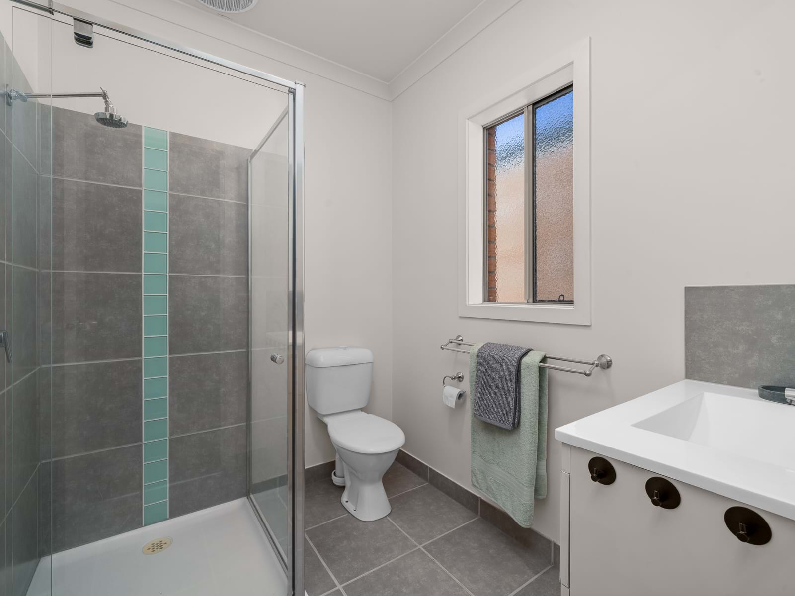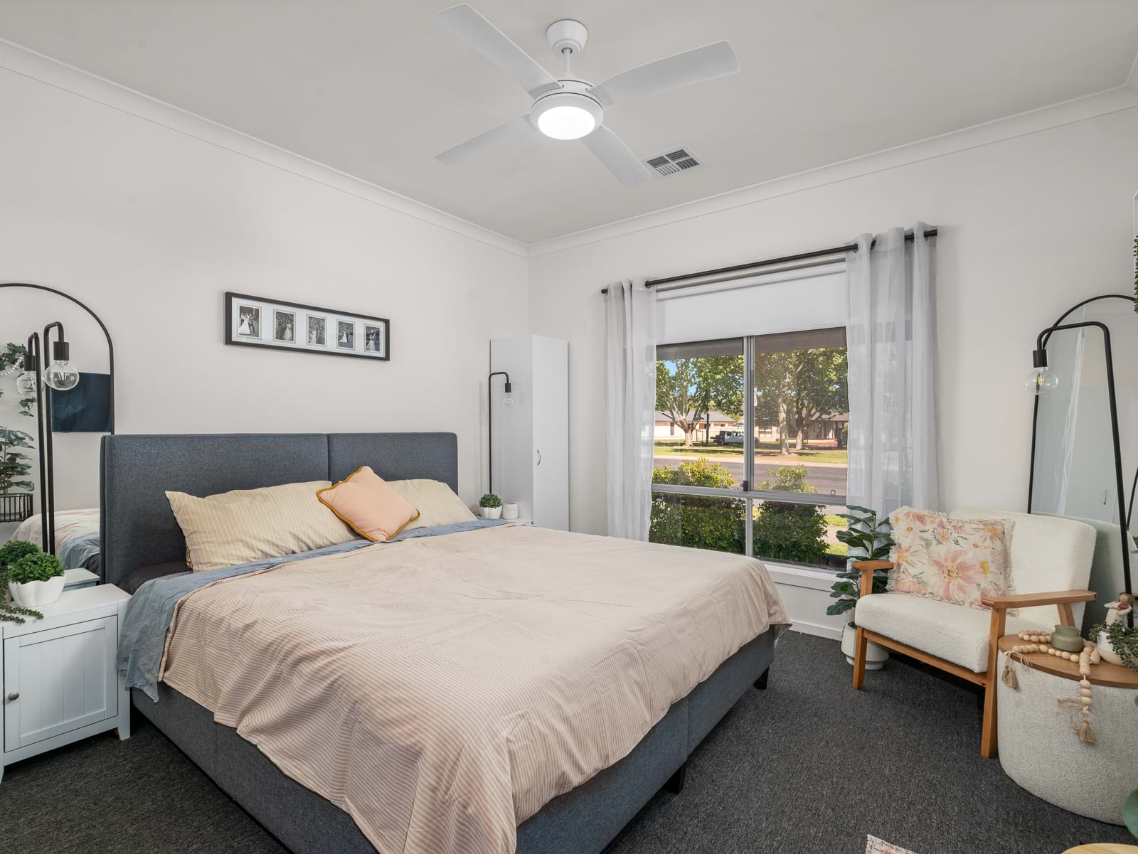 The master bedroom, which includes a walk-in wardrobe and a private en suite, while the two additional bedrooms come with built-in robes and are conveniently located near the main bathroom, which includes a separate toilet. Furthermore, the master bedroom and one of the two additional bedrooms are fitted with ceiling fans.